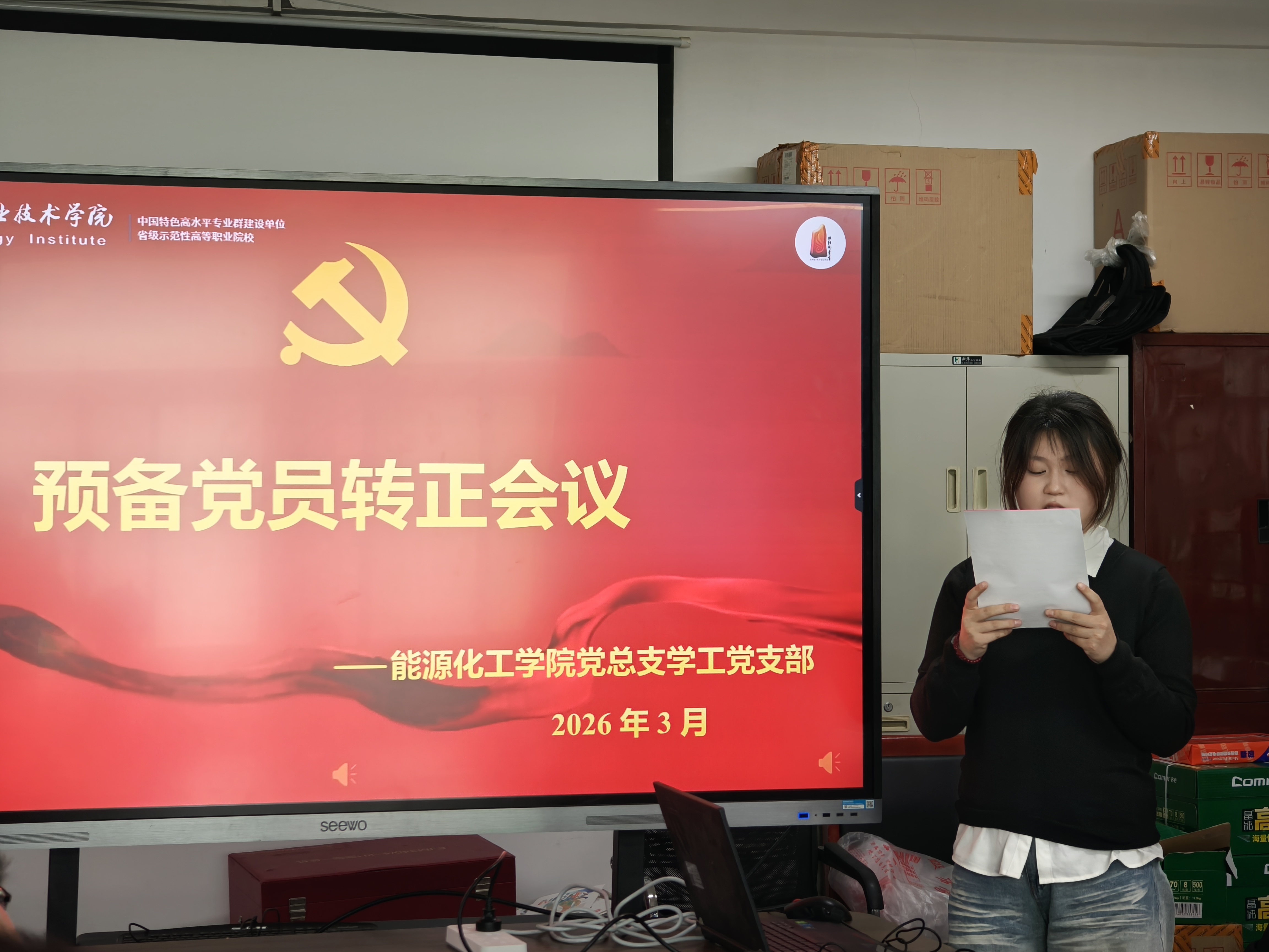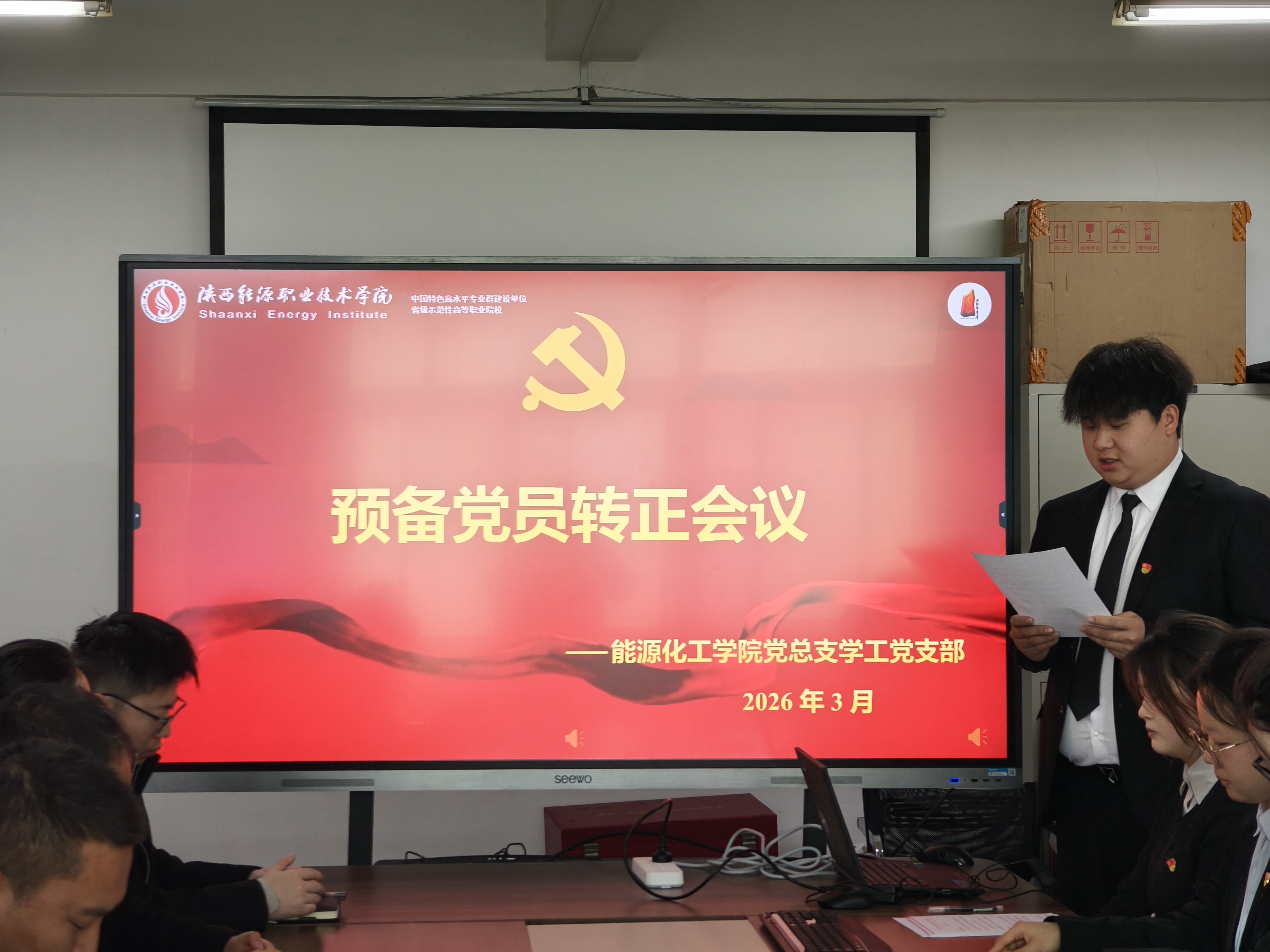 会议在庄严的国歌声中拉开序幕,全体参会党员起立奏唱国歌,浓厚的党性教育氛围贯穿始终,让在场每一位学生党员接受了深刻的思想洗礼。会议严格遵循《中国共产党发展党员工作细则》相关规定,流程规范、严谨有序。首先,学生预备党员依次郑重宣读转正申请书,围绕预备期内的思想成长、学业钻研、志愿服务、班级工作履职等方面进行详细汇报,结合能源化工专业学习特点,分享了理论学习与专业实践结合的收获,深刻剖析自身在理论学习深度、服务同学实效、专业能力提升等方面的不足,明确后续改进方向,并郑重表达了加入中国共产党正式党员的坚定决心与青春担当。