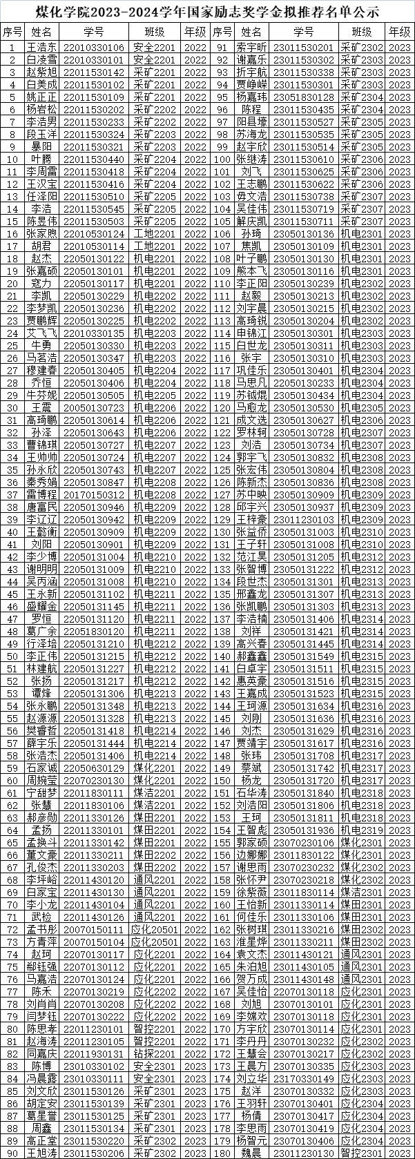 通过班级民主评议、学工会议及学院党政联席会议综合评定,学院拟推荐180名学生上报学校参与国家励志奖学金的评审(附名单)。现对煤炭与化工产业学院2023-2024学年国家励志奖学金名单进行公示,公示日期为2024年11月9日-2024年11月13日,如有异议请在公示期内来我院学工办公室(培训楼409、培训楼603)进行反映。