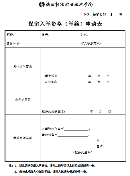 陕西能源职业技术学院保留入学资格(学籍)申请表