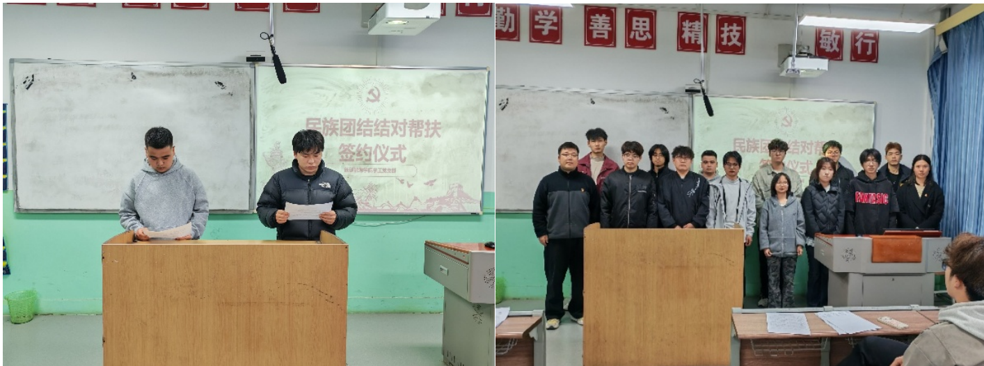 活动中,李聪带领大家学习党的宗教工作政策法规,结合校园安全稳定形势,强调树立正确民族观、宗教观的重要性。随后,班长代表边梓轩与学生代表阿卜杜拉·麦麦提共同宣读结对帮扶承诺书,表达互帮互助、维护团结的决心。在承诺书签约环节,各班班长、团支书与各族学生代表,入党积极分子、预备党员与结对帮扶学生依次签署协议,建立常态化互助机制,将民族团结落到实处。