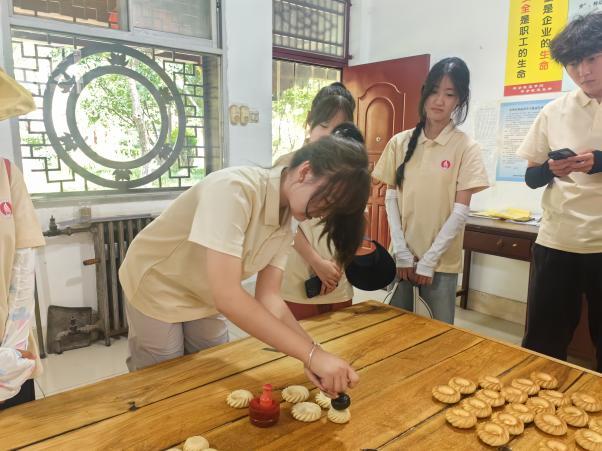 活动中,实践团成员积极参与各项活动,亲身感受传统民俗文化的魅力。园内负责人带领实践团参观了传统农具,大家亲手操作石碾、石磨,在劳作中体会农耕时代的生产智慧;在纺织机前,成员们尝试纺线织布,近距离感受传统农耕与手工业文化的智慧,感受手工业者的辛劳与坚守。手艺人现场展示非遗项目鹿糕馍的制作技艺,学生们参与实践制作,深度体悟饮食文化的传承脉络;随后,实践团参观园内古画与名人书法作品,在笔墨间感悟传统文化的文字魅力与精神内涵;最后,通过观赏墙面壁画展板中呈现的名言、民俗方言等内容,进一步深化对当地民俗文化的认知。
