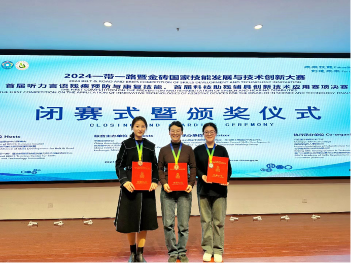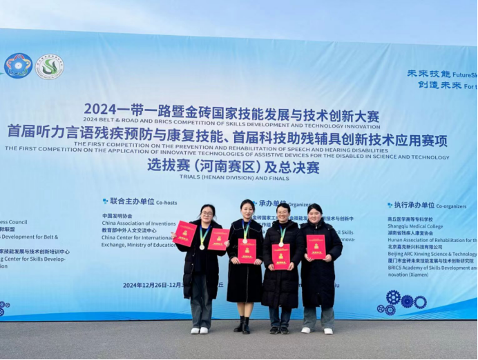 2024年12月28日至12月30日,“2024一带一路暨金砖国家技能发展与技术创新大赛暨首届听力言语残疾预防与康复技能全国总决赛”在商丘医学高等专科学校顺利举办。赛事汇聚了全国26个省份二个赛道141支参赛队伍,经过激烈的竞争,我校现代康养学院教师何芳梅指导的康复治疗技术专业学生王妍妍在首届听力言语残疾预防与康复技能赛道荣获国赛二等奖,何芳梅荣获优秀指导老师奖;现代康养学院教师邢少娜和张妤荣获首届听力言语残疾预防与康复技能职工组三等奖;我校获得优秀组织单位奖。