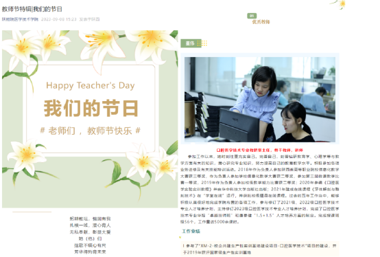 根据《陕西能源职业技术学院庆祝2023年教师节活动方案》(陕能院党〔2023〕88号),医学技术学院党总支于9月6日-10日开展线上线下多种活动,营造节日仪式感,感念师恩树榜样,新老传承守初心,增强了教师职业荣誉感、幸福感。