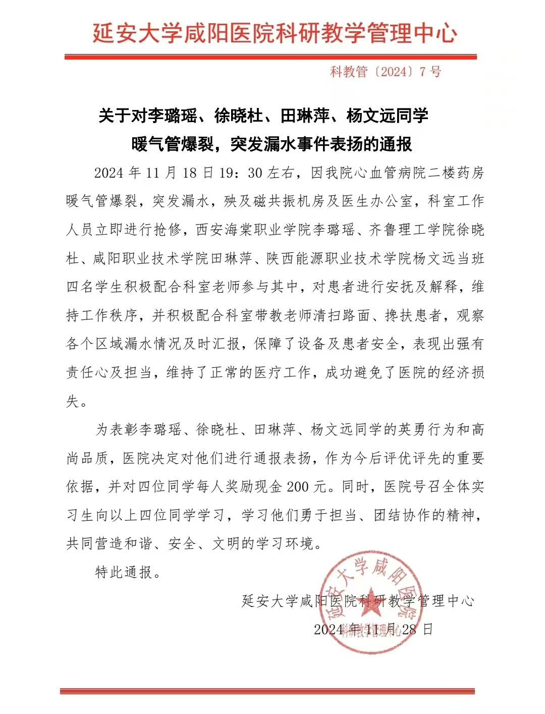 为了表彰杨文远等四名同学的英勇行为和高尚品质,心血管病院决定对他们进行公开表扬,作为今后评优评先的重要依据之一,并给予每位同学现金奖励200元以资鼓励,号召全体实习生向杨文远同学学习,共同营造一个和谐、安全、文明的学习环境。